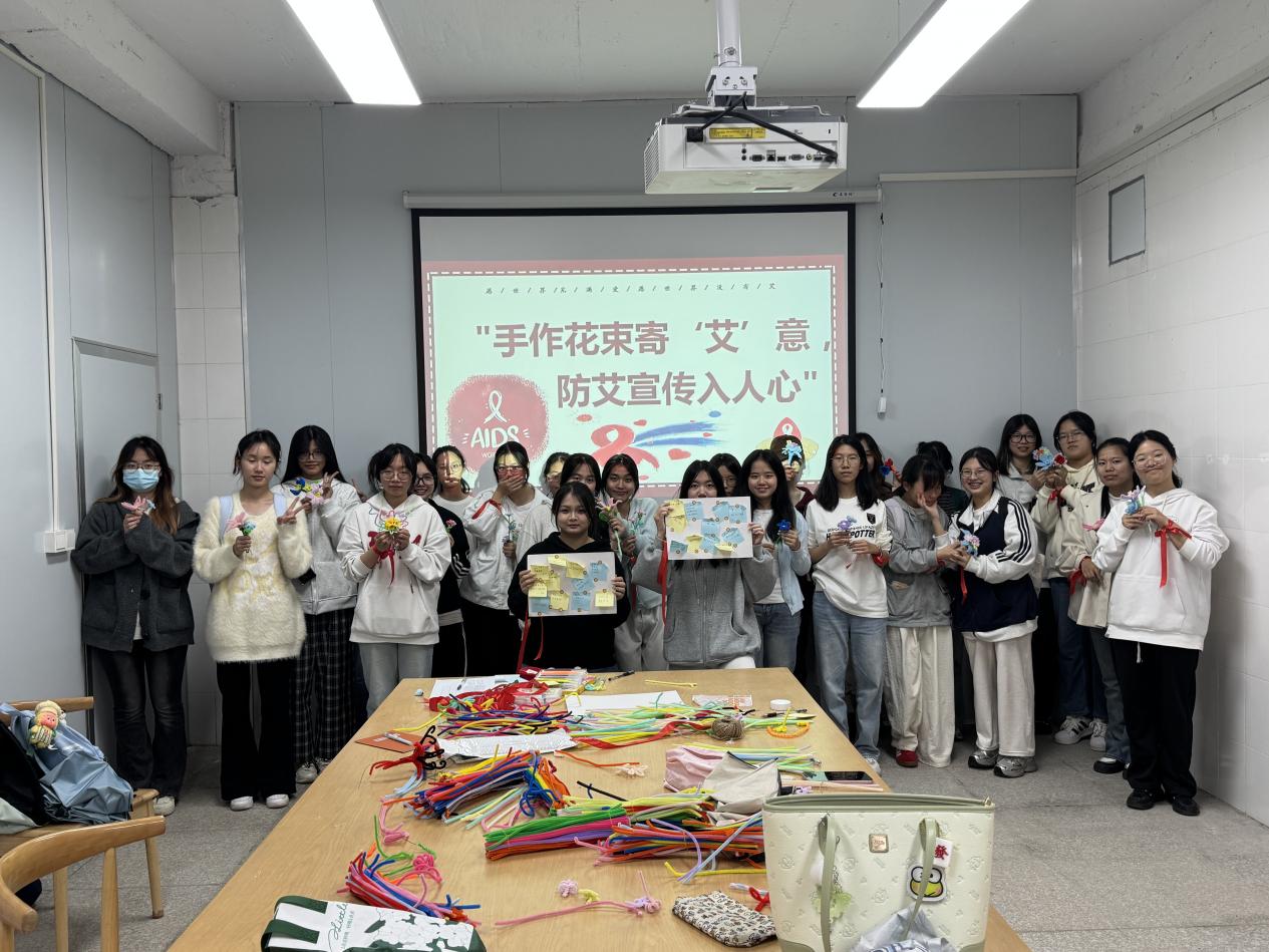 活动现场,员工干部卢韵如同学和员工干部郑淑妍同学通过科普讲解、案例分享传递防艾知识,帮助同学们科学认识疾病、破除认知误区、树立科学理性的防护观念;讲解结束后,同学们一同动手制作扭扭棒花束,并结合所学构思防艾宣语,将“科学防艾、温暖关爱”的理念融入创作,现场氛围温馨活跃。