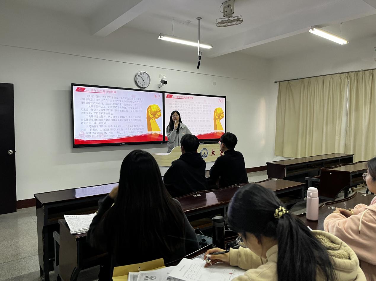 党课伊始,由主讲人陈嘉雯同学宣布此次党课的主题内容——深入学习贯彻《中国共产党思想政治工作条例》。并主要从以下几个方面进行学习讨论:一、认识《条例》颁布实施的重大意义,带领同学认识到《条例》对于坚持和加强党对思想政治工作全面领导,巩固全党全社会思想上的团结统一,凝聚奋进新征程磅礴力量的根本保障作用;二、把握《条例》的核心内容与基本要求,重点学习了思想政治工作根本任务、原则要求、主要内容、职责分工等。引导同学们明确,要坚持用习近平新时代中国特色社会主义思想铸魂育人,坚定拥护“两个确立”、坚决做到“两个维护”,自觉在思想上政治上行动上同党中央保持高度一致。