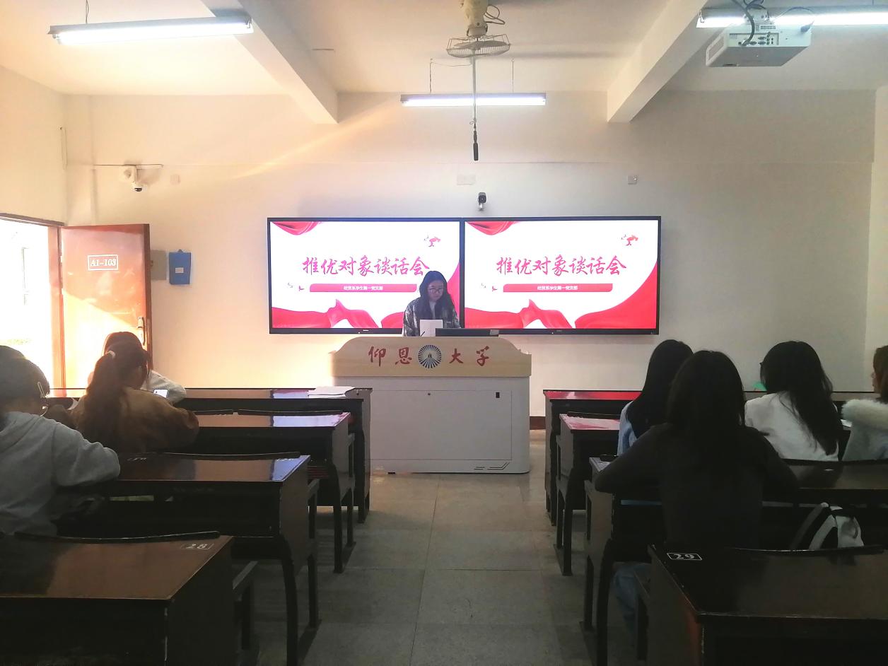 为扎实做好入党积极分子培养考察工作,严格党员发展程序,为党组织筛选储备优秀后备力量,3月23日下午,经贸系员工第一党支部于仰恩楼A1-103组织开展入党积极分子推优谈话会。支部支委黄培真、林烽、林丽华出席本次会议。