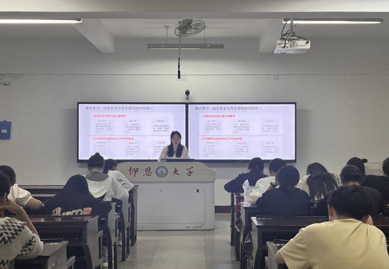 会上,各班代表依次上台进行学习分享。各班代表紧密围绕数字网络安全、网络舆情防范、涉密信息保护等重点内容,结合2024-2025年网络信息泄露、网络谣言传播、电信网络诈骗等最新时事典型案例,通过PPT展示、短视频讲解等多样形式开展交流分享,把理论知识与现实警示案例相结合,深刻剖析数字化时代网络风险隐患,畅谈新时代青年严守网络底线、坚定政治立场、筑牢党性修养的责任担当。分享环节氛围浓厚,内容详实、条理清晰,让在场成员接受深刻警示教育。